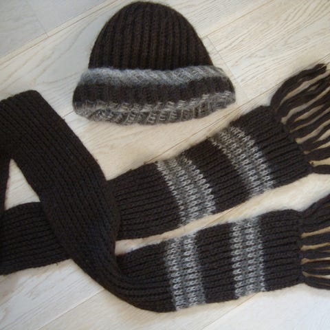 Pris for hue, vanter og halstørklæde på 95 cm.