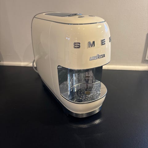 Smeg Lavazza espressomaskine i rød farve. Designet til at brygge espresso med Lavazza-kapsler. Kompakt størrelse, egnet til hjemmebrug.