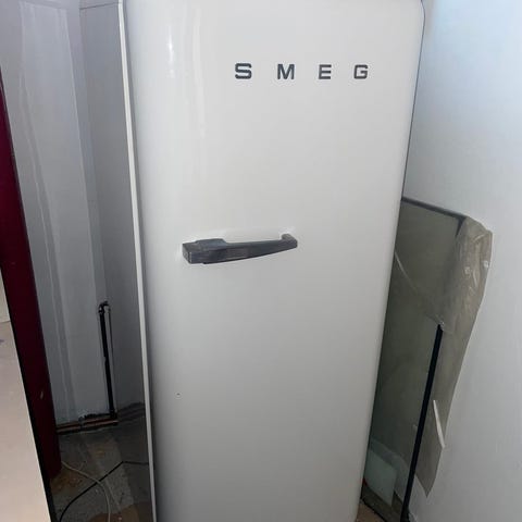 Smeg køle-fryseskab med to døre, der kombinerer køleskab og fryser i ét apparat. Enheden har et retrodesign og er velegnet til opbevaring af fødevarer ved både køle- og frysetemperaturer.