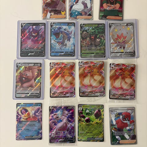 Pokémon Sammelkort med motiver af Sandaconda V og Pikachu V. Kortene er standardstørrelse og bruges til samling eller spil. Bud modtages.