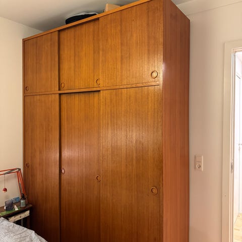 Klædeskab i teakfiner - solidt som fremstår fint - dog ikke nyt.