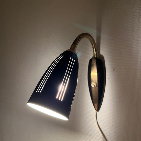 Dansk produceret sengelampe med flexarm i messing, afbryder på vægpladen, hvor der er 2 huller til ophæng.