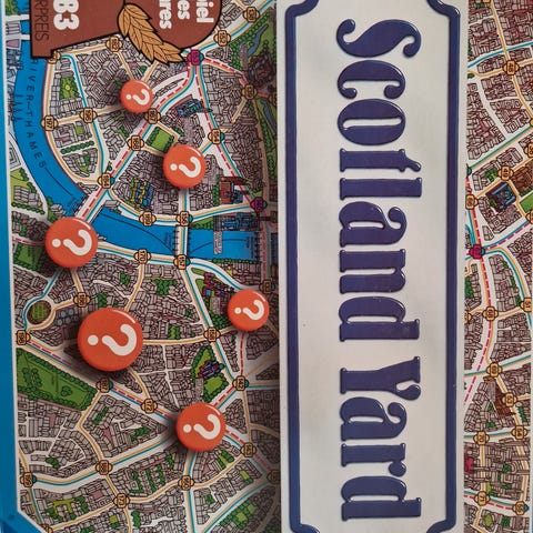 Scotland Yard brætspil med spillebrikker, spilleplade og regler.