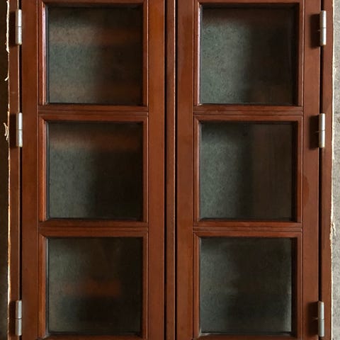 Vinduet er sidehængt i mahogni med haspeluk og stormkrog