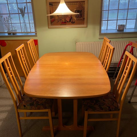 Spisebord med 2 tillægsplader og 6 stole
