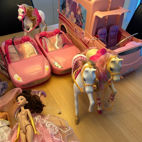 Byd gerne. Barbie legetøjssæt indeholdende en pink bil med gul kabine, en pink hestetrailer, 3 heste, en hestevogn med seletøj, et sæt møbler bestående af et bord og fire stole samt diverse små tilbehørsdele som madvarer og service. Sættet er designet til leg med Barbie-dukker og tilbehør.