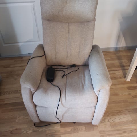 Super fin elektrisk lænestol med sædehejs, så det er nemmere at komme op fra den. Fodstøtte er også elektrisk og køres op, når den skal i hvile pos.