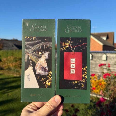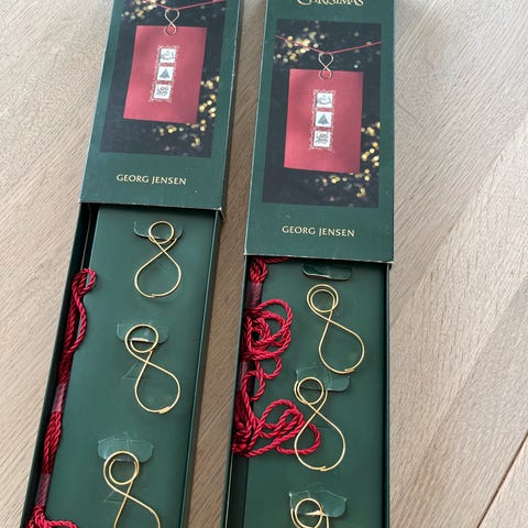 Georg Jensen Golden Christmas juleklips til julekort eller lignende. Sættet indeholder tre ornamenter med rød snor til ophæng. Kan sendes.