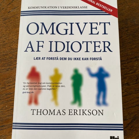 Thomas Erikson Surrounded by Idiots bog med fokus på de fire typer af menneskelig adfærd og hvordan man effektivt kommunikerer med hver type i både erhvervslivet og privatlivet. Bogen forklarer de fire adfærdstyper: Røde, Gule, Grønne og Blå, og giver indsigt i, hvordan man kan tilpasse sin kommunikation for bedre forståelse og samarbejde. Indeholder praktiske informationer til interaktion med forskellige personlighedstyper.