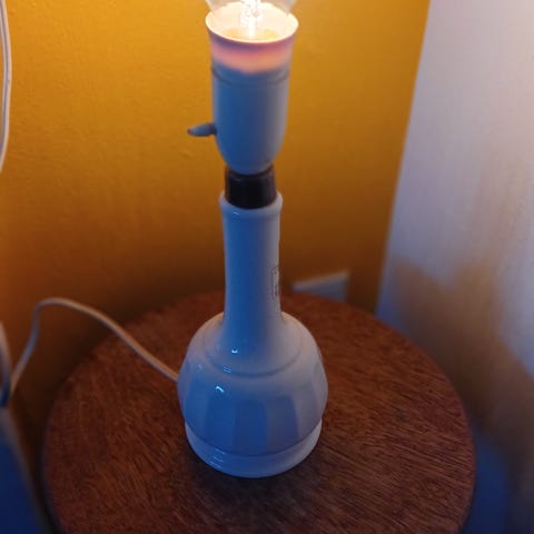 Denne bordlampe har et hvidt porcelænsdesign med en rund base og en lang hals. Den har en E27 fatning til en pære og er udstyret med en hvid elektrisk ledning med en europæisk stikkontakt. Lampen måler cirka 27 cm i højde.