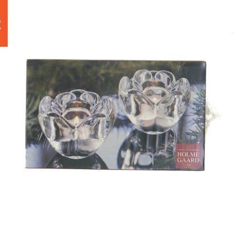 Sæt af to lysestager fra Holmegaard, model Cabernet, designet af Peter Svarrer. Lysestagerne er fremstillet af glas og har en højde på 12,5 cm. Cabernet-serien er kendt for sin moderne og elegante stil, der tilføjer atmosfære og charme til ethvert hjem. Lysestagerne kommer i original emballage, der viser et billede af produktet og giver information om designet.
