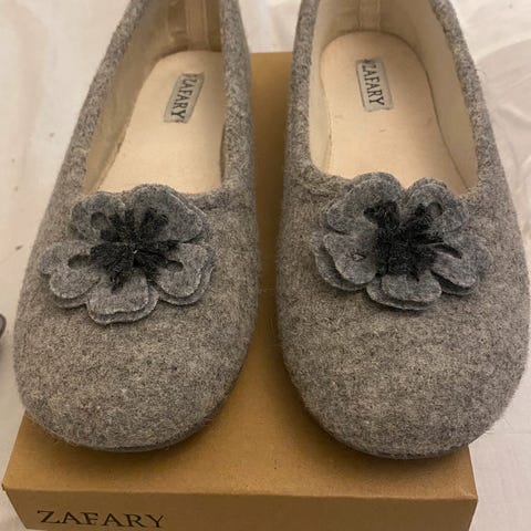 Dette er et par unicorn hjemmesko i en farverig lilla nuance. Hjemmeskoene har et design, der ligner en enhjørning med øjne, ører og et horn. De er bløde og har en skridsikker sål, hvilket gør dem komfortable at gå rundt i indendørs. På sålen står der 'Made in China' samt størrelse 13-1. Hjemmeskoene har en længde på 20,5 cm.
