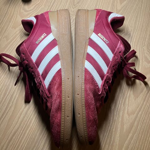 Dette er et par Adidas sneakers i farverne navyblå og rød. De har den klassiske tre-stribe detalje på siden og Adidas-logoet på bagsiden. Skoene er i størrelse 45,5, hvilket passer til voksne mænd. Skoene har snørebånd og en hvid gummisål. Der er synlige tegn på brug, især på sålen, som har lidt snavs, men generelt er skoene i god stand.