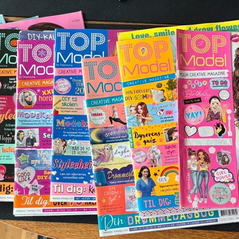 Dette er et blad fra serien TOPModel, vist som en kreativ magazine udgave. Den indeholder en blanding af mode, kreativt indhold, og interaktive elementer som drømmedagbøger og inspirerende historier. På forsiden er der farverige illustrationer og banners, der fremhæver indholdet. Bagsiden beskriver abonnementsfordele og kampagnetilbud for læsere.