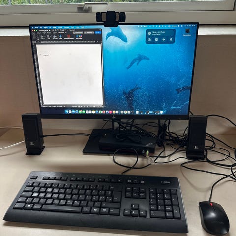 11x skærme + Jabra headset (trådløs), 9x trådløs tastatur + mus, 10x computer