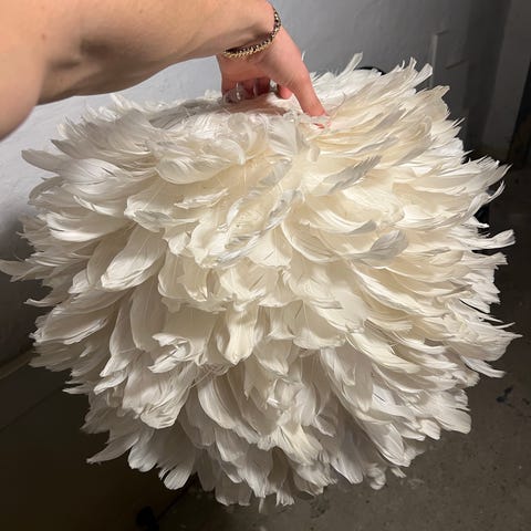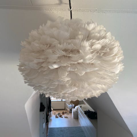 Flot fjerlampe med hvide fjer. Giver et rigtig hyggeligt lys. Loftslampe.