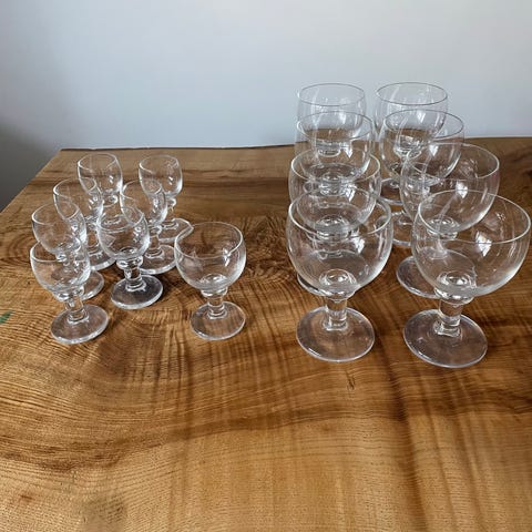 Holmegaard glas sæt bestående af forskellige typer glas i klart glas. Sættet indeholder flere glas med fod, velegnet til servering af drikkevarer. Materialet er glas, og designet er enkelt og funktionelt.