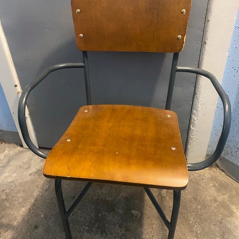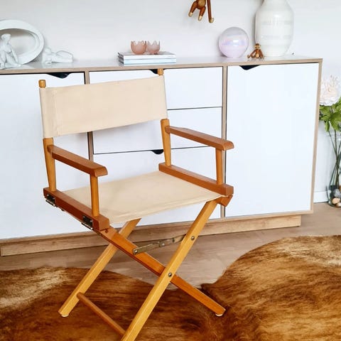 Foldbar instruktørstol købt i Paustian i de tidlige 90'ere. Stolen er i god stand men den har nogle mærker i malingen. Stofsæde og -ryg er i superfin stand. Den er meget behagelig at sidde i.