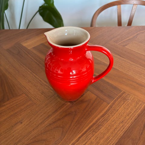 2 smukke Le Creuset røde kander , 1 liter kr. 100, 2,1 liter kr. 200. Rabat ved køb af begge