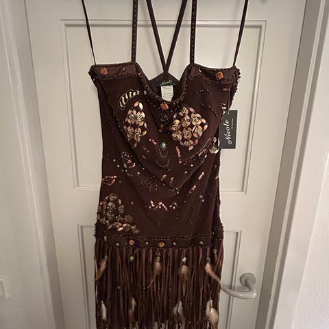 Jeg sælger min fine kjole med sten og glitter. Har fjer om ærmerne ved håndleddet. Købt fra Tyrkiet, størrelsen er et estimat.