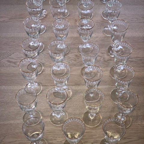 “Kongeå” fra Holmegaard. Med guldkant på nær tre stk, hvor kanten enten er slidt af eller aldrig har været der.