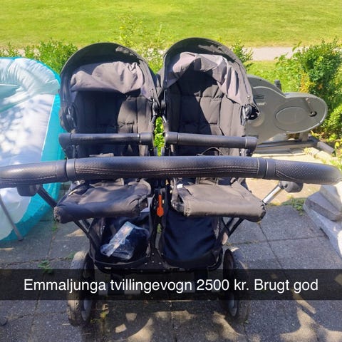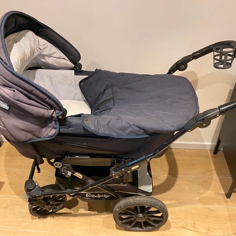 Emmaljunga barnevogn med liggedel i sort og hvid. Vognen er udstyret med store hjul og en rummelig kurv under sædet. Passer til spædbørn og giver en komfortabel liggeplads.