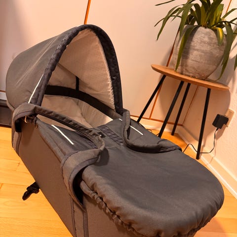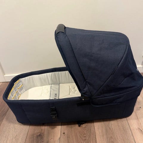 Den står pæn, ren og klar til brug – perfekt både til barnevognen og som en tryg soveplads indendørs.