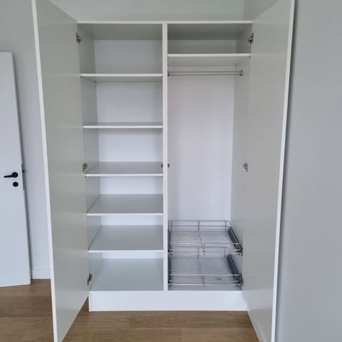 Hvidt garderobeskab fra Svane Køkkener. Helt nyt, aldrig pakket ud af emballagen, fejlkøb. 195 cm højt, 50 cm bredt. Fem hylder. Venstrehængt dør. Nypris 2.235 kr