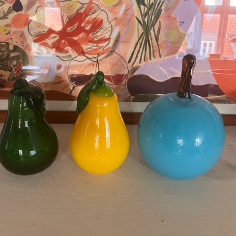 Dekorationssæt bestående af glasfrugter i forskellige former og farver, herunder rød peberfrugt, gul pære, aubergine, grøn agurk, rød gulerod og lilla drueklase. Sættet kan anvendes som borddekoration eller pynt i hjemmet.