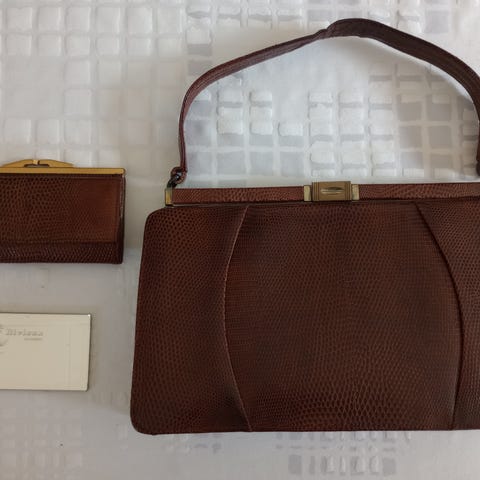 Fin klassisk håndtaske i sort skind. Lille ruskindspung i materiale som indtræk følger med. Mål h/b 25x20cm