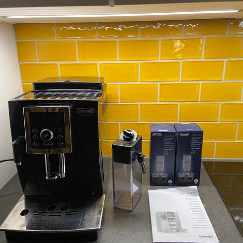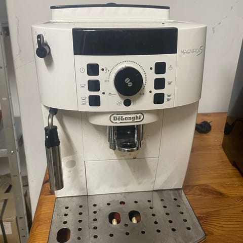 DeLonghi Magnifica espressomaskine i sort farve. Maskinen har et digitalt kontrolpanel med flere funktioner til brygning af kaffe og espresso. Den inkluderer en indbygget mælkeskummer og en aftagelig vandbeholder. Designet til brug i hjem eller små kontorer.