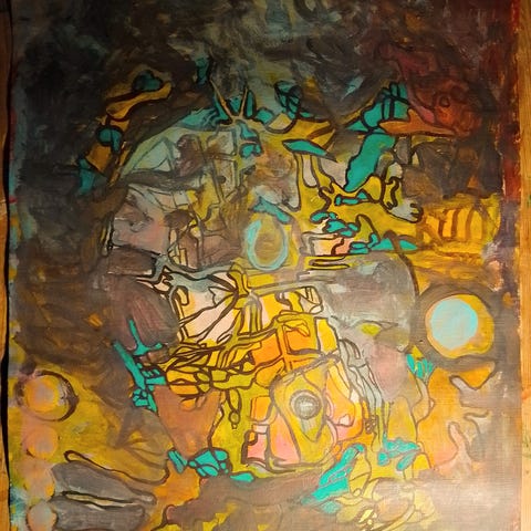 Jesper Seneca maleri, akryl på lærred. Motiv med fantasifigurer på grøn-gul baggrund. Betitlet "New Tomorrow."