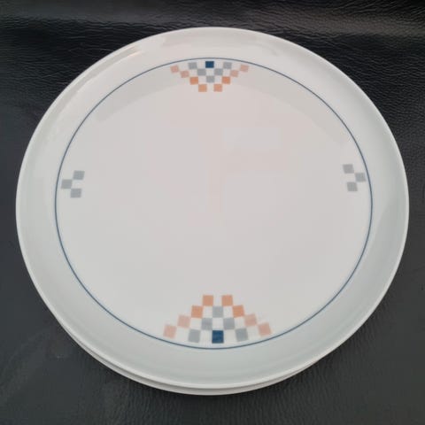 Bing & Grøndahl 326 frokosttallerkener, porcelæn i lysgrålig farve. Sættet består af seks tallerkener, der kan anvendes til daglig brug eller til servering ved måltider.
