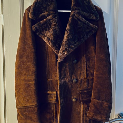 Den er fuldt foeret med lammeuld og er sååå dejlig varm og blød. Den lukkes vha. en indvendig samt to udvendige knapper, og kan bindes med et bælte.