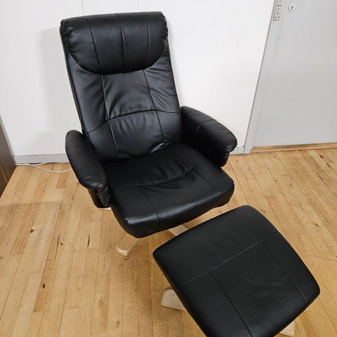 Lænestolen har en drejefunktion og er designet til komfort og afslapning. Materialet er ægte læder, og farven er sort.