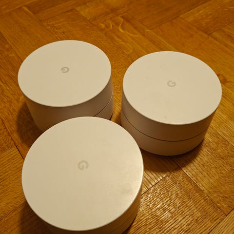 Google Wifi Router i en 3-pak med hvid farve. Systemet er designet til at skabe et sammenhængende Wi-Fi-netværk i hjemmet for bedre dækning og stabilitet.