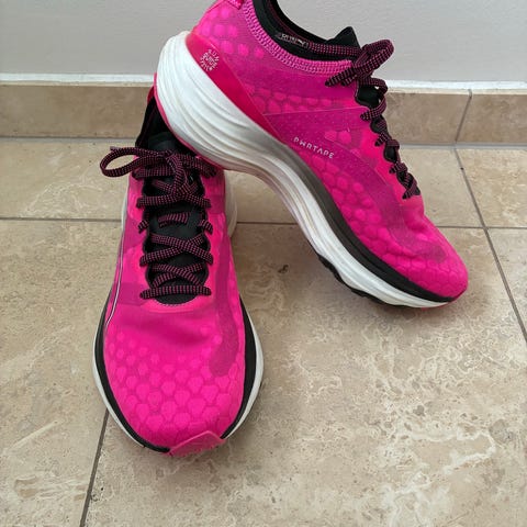 Puma Electrify Nitro løbesko til herre i størrelse 42.5 Skoene er gule og designet til løb med fokus på komfort og ydeevne.