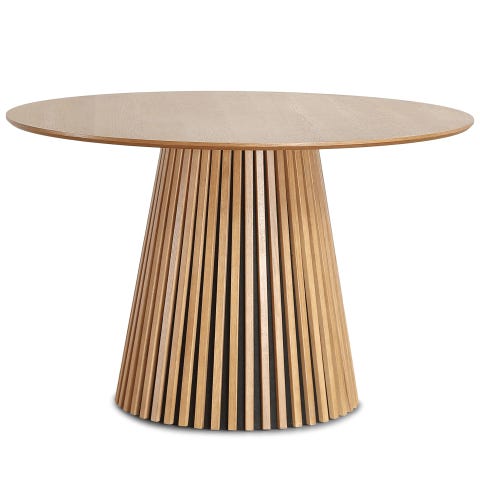 Spisebord i træ med rund bordplade og metalben. Bordet har en naturlig træfinish og ben i metal, hvilket giver et enkelt og funktionelt design. 4 sortlakerede stole. Til spisestue eller køkken. Diameter på bord 110 cm.