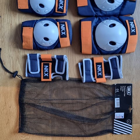 NKA Protection Set Pro Kid 3-pak til rulleskøjter med beskyttelse til knæ, albue og håndled. Sættet er designet til børn og har justerbare blå stropper for sikker pasform.