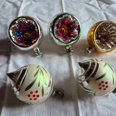 12 stk intakte glaspynt fra 50erne med original kasse, der er Stearin rester , ikke forsøgt fjernet. Jeg sender med Dao.