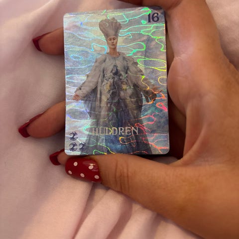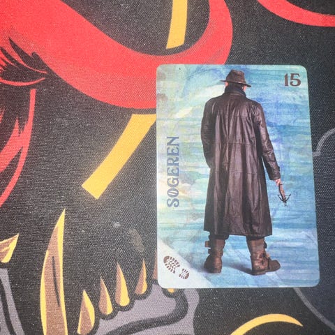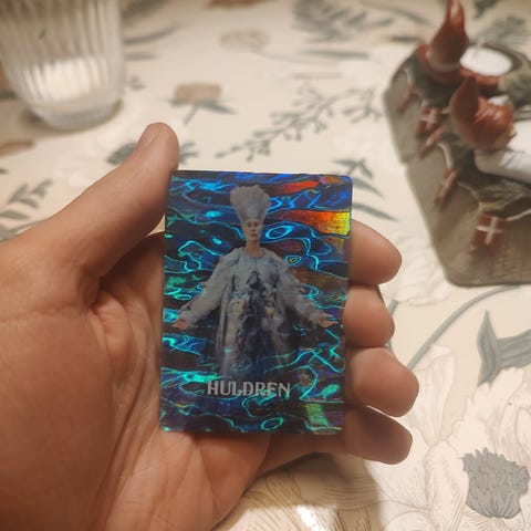 Huldrén samlekort med holografisk effekt. Kortet viser en karakter i blått antrekk og hvit hatt. Passer til samling eller bytte.