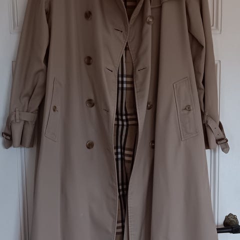 Flot trenchcoat fra Burberry i en mørk beige farve. Desværre uden bæltet og med to små skader, deraf prisen. Se billede af kraven og “bælte stroppen”