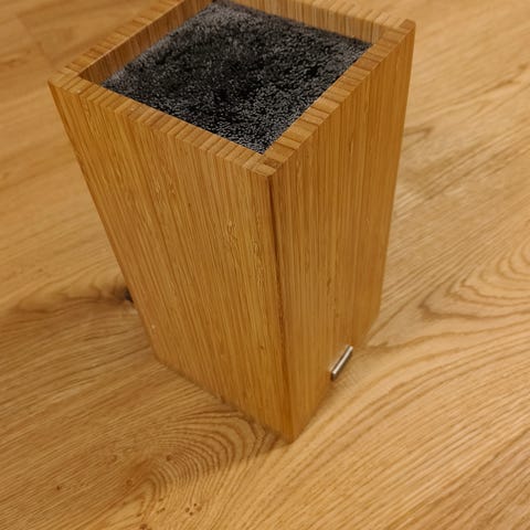 Fiskars knivblok lavet af bambus. Designet til opbevaring af knive med en indvendig fleksibel indsats, der holder knivene sikkert på plads. Blokken har en firkantet form og gummifødder for stabilitet på overflader.