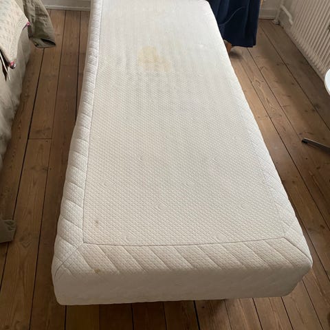 Boxmadras 80 x 200 cm, mørkegrå med træ meder - ukendt mærke og alder. Kan afhentes gratis.