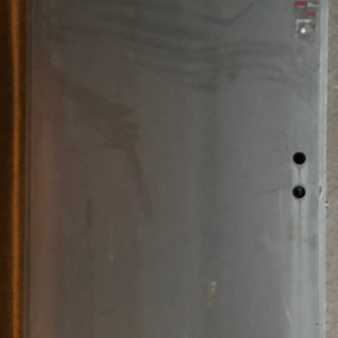 Døren er i plast med materet glas, alu på trin, der har været film på som er taget af. Der kan sidde rester af filmen.