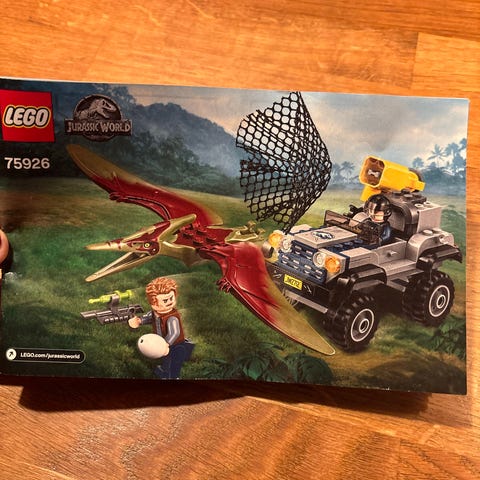 LEGO Jurassic World 75915 legetøj med forskellige klodser og figurer, herunder en flyvende dinosaur og to minifigurer. Sættet indeholder blå, grå og hvide byggeklodser i forskellige størrelser og former.