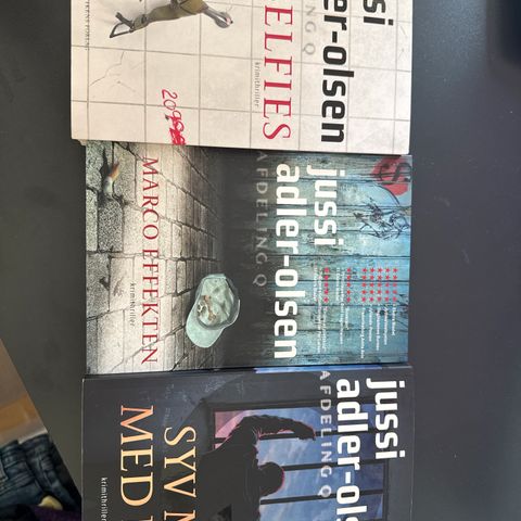 Samling af bøger skrevet af Jussi Adler-Olsen. Indeholder forskellige titler i serien, alle på dansk. Bøgerne er forskellige i størrelse og farve, og de tilhører genren krimi og spænding. 20 kr. stykket