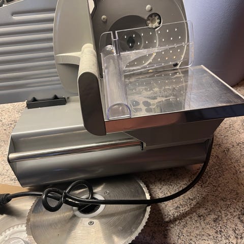 Praktisk AKA skæremaskine til brød, pålæg og kød. Elektrisk på 220 V, monteret med 150 cm lang , hvid plastledning med stikprop.