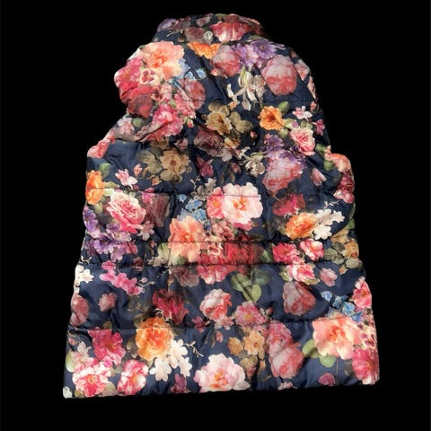 Jakke, Fugle beige blomster , Ny jakke 116 / 122 marineblå mørkeblå blomstrede f, str. 116