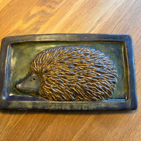 Ejvind Nielsen smukt relief dekoreret med et egern. Farverne er grøn, gylden og brun.